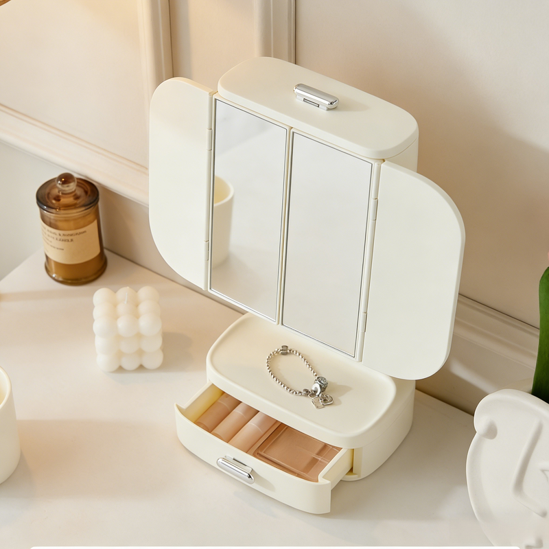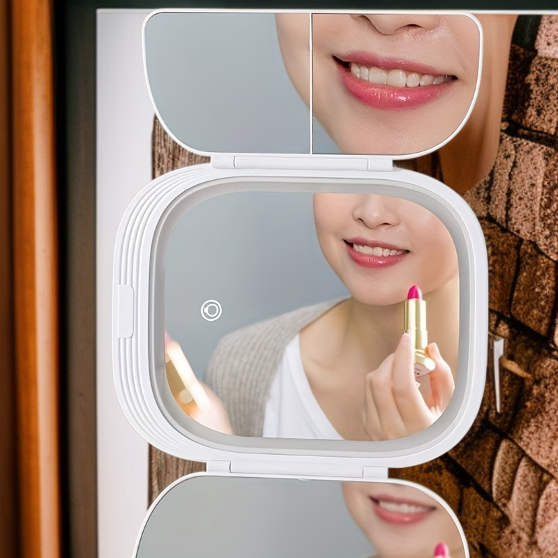 ● Der faltbare Schminkspiegel mit integrierter LED-Beleuchtung sorgt jederzeit für optimale Sicht beim Schminken und Stylen, selbst bei schlechten Lichtverhältnissen. ● Praktische Aufbewahrungsschublade bietet ausreichend Platz für Kosmetik, Schmuck und Accessoires – alles griffbereit und ordentlich verstaut. ● Modernes, platzsparendes Design macht den Spiegel zum unverzichtbaren Highlight in jedem Badezimmer und eignet sich perfekt für kleine Räume. ● Hochwertige Materialien und Verarbeitung garantieren Langlebigkeit und einfache Reinigung – ideal für den täglichen Gebrauch.